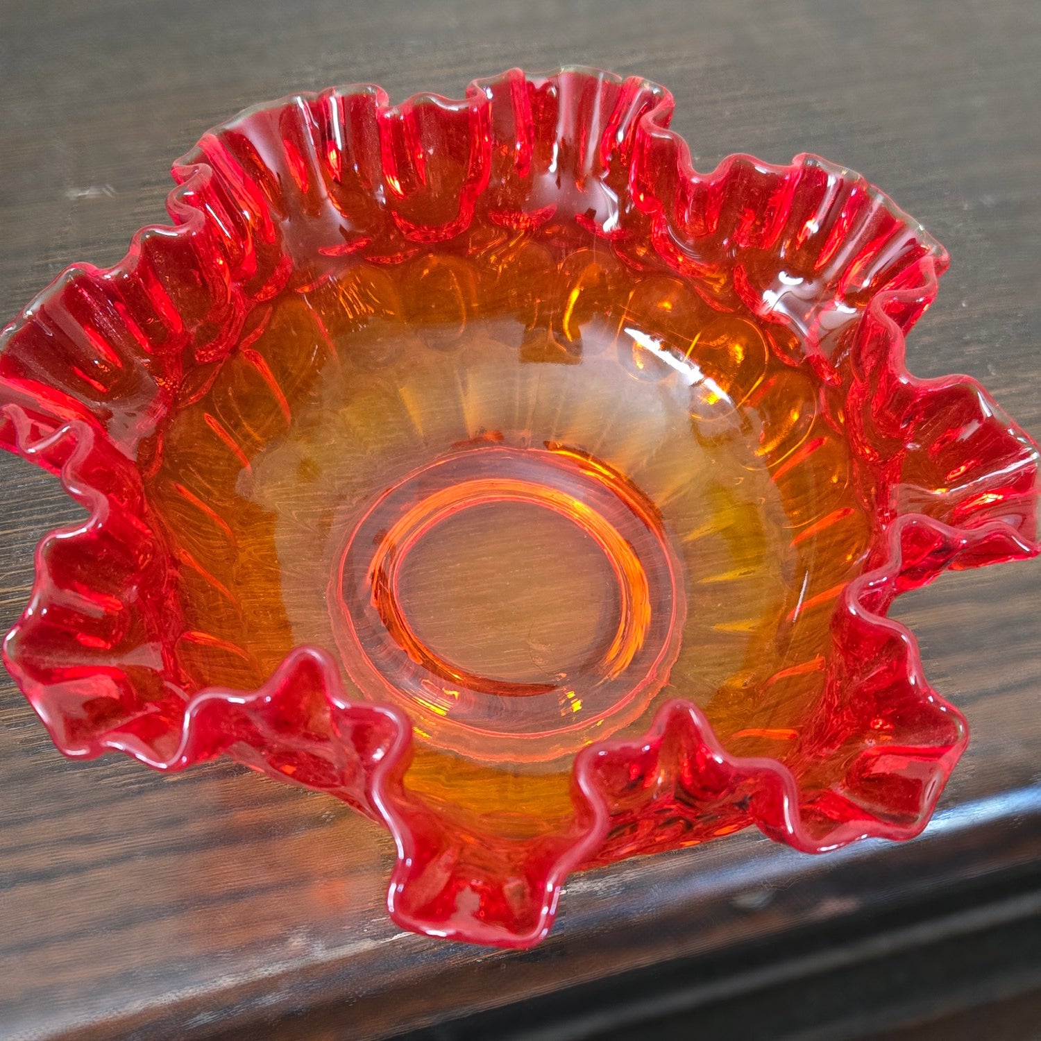 Crafted in the 1950s–1960s, this piece features the classic Coin Dot (Thumbprint) pattern with a hand-ruffled edge and vivid red-to-orange gradient known as Amberina.